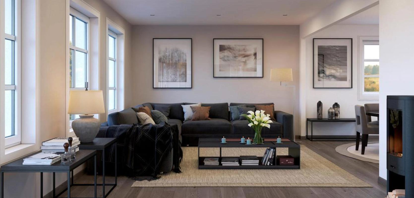 I dag er det blitt svært vanlig med åpne kjøkken- og stue-løsninger, men det er ikke alltid det er like praktisk. Her er det skyvedør mellom stua og kjøkkenet, slik at man kan ha det åpent mellom rommene, men man kan også stenge av ved behov. Hvis man har behov for flere stille steder til hjemmekontor, kan for eksempel kjøkkenbordet benyttes. Eller motsatt, hvis et av barna gjør lekser i stua, og de andre lager pizzadeig med kjøkkenmaskin på kjøkkenet, så kan man stenge ute bråket. Man kan også lukke bort alt rot på kjøkkenet, og sette seg i stua med gjester. Fra gangen er det er også en egen dør inn til kjøkkenet, slik at det er kort vei å bære matvarene.