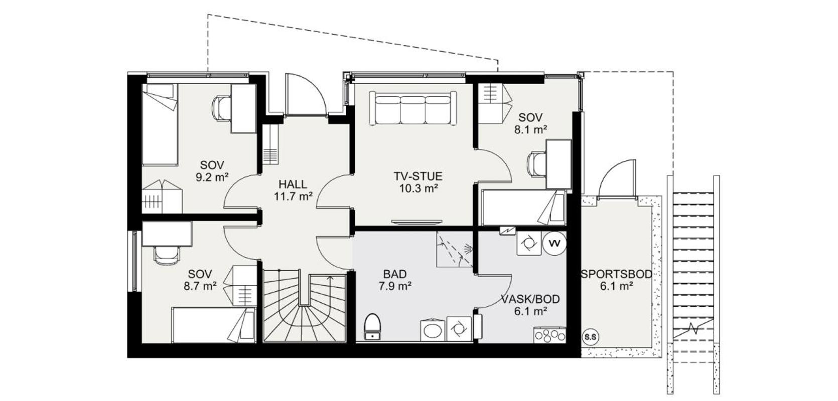 Signatur 308 er spesielt tilpasset en skrå tomt, og hovedinngangen er plassert i underetasjen. Under balkongen på hovedplanet finner du en romslig hall med inngang til en tv-stue, et stort bad med tilgang til eget vaskerom og to praktiske soverom. Det tredje soverommet ligger innenfor tv-stuen. På utsiden er det også en egen sportsbod, perfekt for oppbevaring av sportsutstyr eller hagemøbler.